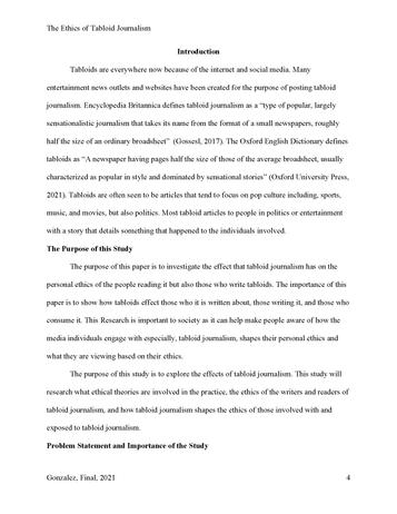 This paper covers the ethics of those who write and read tabloids and how the publication and reading of tabloids affect personal ethics.
